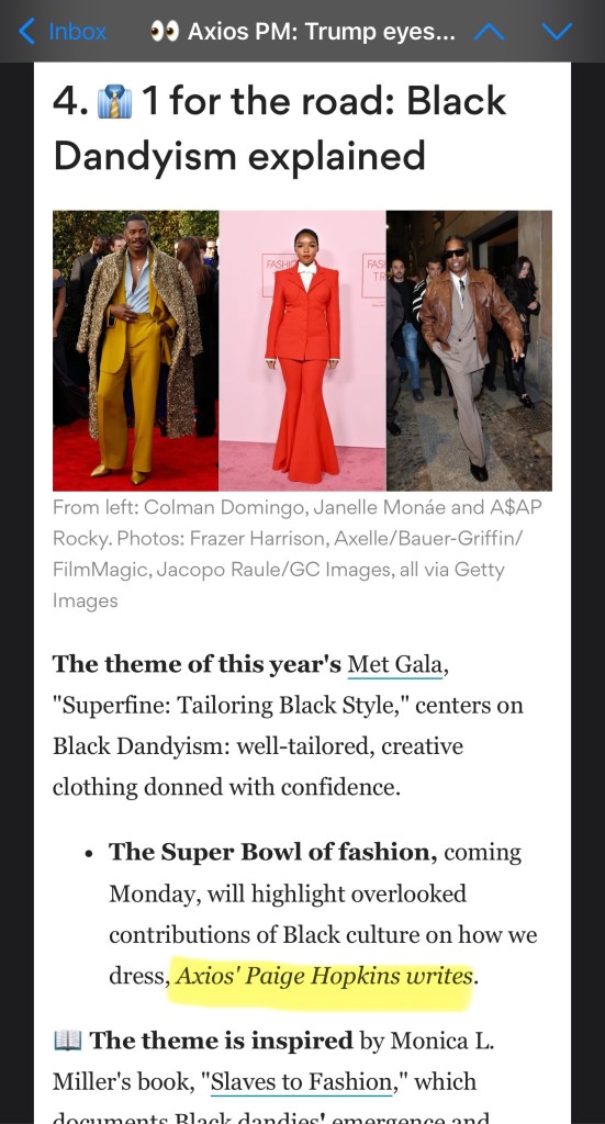 Paige’s work on Black dandyism featured in Axios co-founder Mike Allen’s PM newsletter.